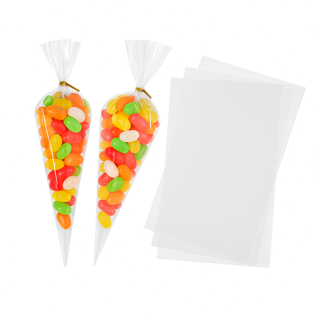 - Crystal Clear Finish: Show off sweets, chocolates, popcorn, bath salts, or small gifts in a sleek, transparent cone bag.